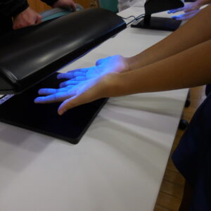 - 次に「手洗いチェッカー」に手を差し込みます。専用ローションがブラックライトに反応して、白く映っているのが見えます。