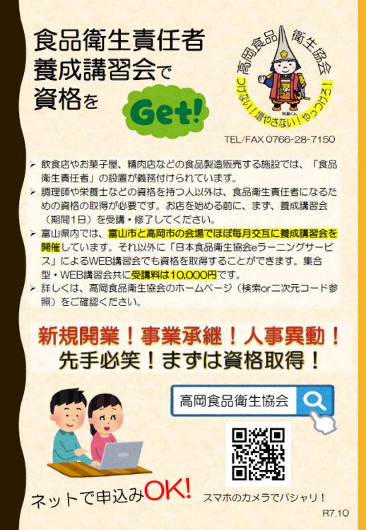 一般社団法人富山県食品衛生協会では、富山県知事、富山市長が認定した「食品衛生責任者養成講習会」を実施しています。